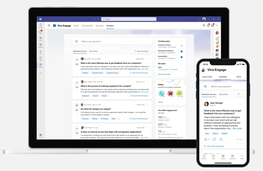 - Answers in Viva: A new capability that will use artificial intelligence (AI) to match employee questions to answers and experts across the organization to help leverage collective knowledge. Answers in Viva can surface similar questions that have been answered, recommends topics and experts, and highlights the top solutions. It will be available to licensed Viva suite users within the Viva Engage app.