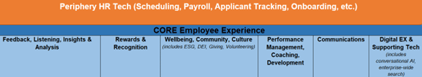 - Periphery HR Technologies. While not considered core to EX, these are systems that are potential sources of frustration and friction. This includes technologies that support fairly transactional interactions, such as scheduling, payroll, onboarding, applicant tracking, etc. Often, if the basics of putting in hours, requesting schedule changes, or filling out onboarding forms are unwieldy, hard to use, and exasperating, it can contribute to dissatisfaction.