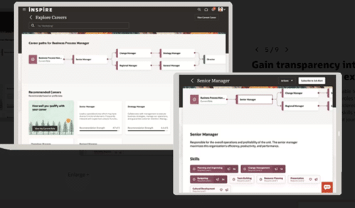 - Career Paths: Helps employees to find different career opportunities in the organization, and provides step-by-step guidance and development plans tailored to each individual based on their Oracle Cloud HCM profile.