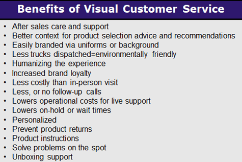 The visual customer support model typically allows a one-to-one video interaction with an agent or tech support representative that could occur via a variety of devices or channels. There are a wide range of advantages to this approach.